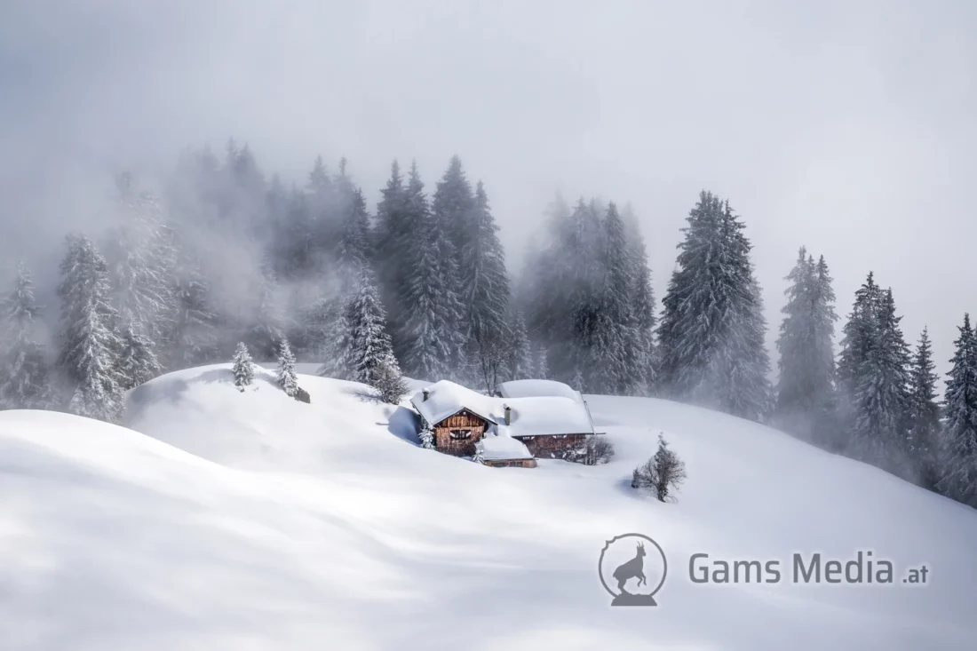 Eine Berghütte, umgeben von zauberhaften Winterbedingungen.