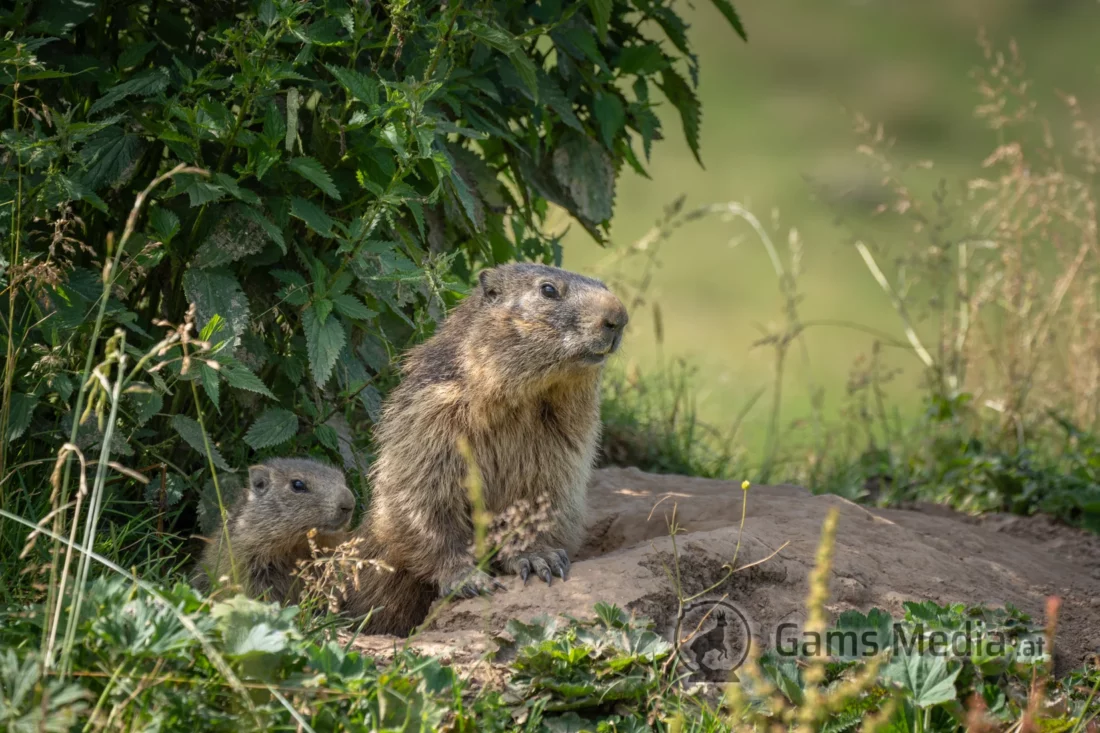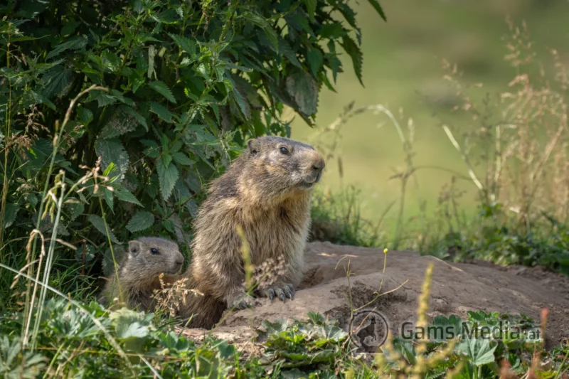 Murmeltiere beim Verlassen ihrer Höhle im Sommer.