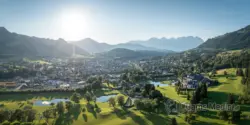 Das Schlosshotel Kitzbühel und der Kaps Golfplatz, am Ende des Tages, mit Kitzbühel im Hintergrund.